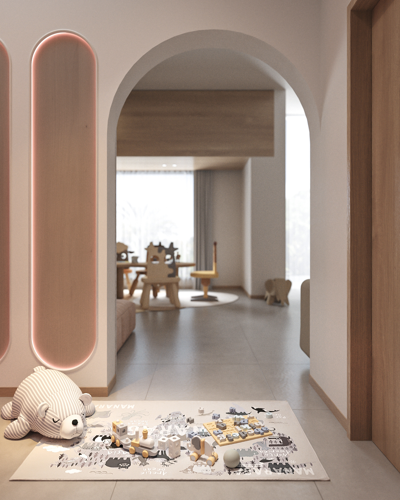 ✔ Layered Lighting Plan – A combination of recessed lighting, pendant lamps, and nightlights creates a cozy ambiance while providing functional illumination for study and play.