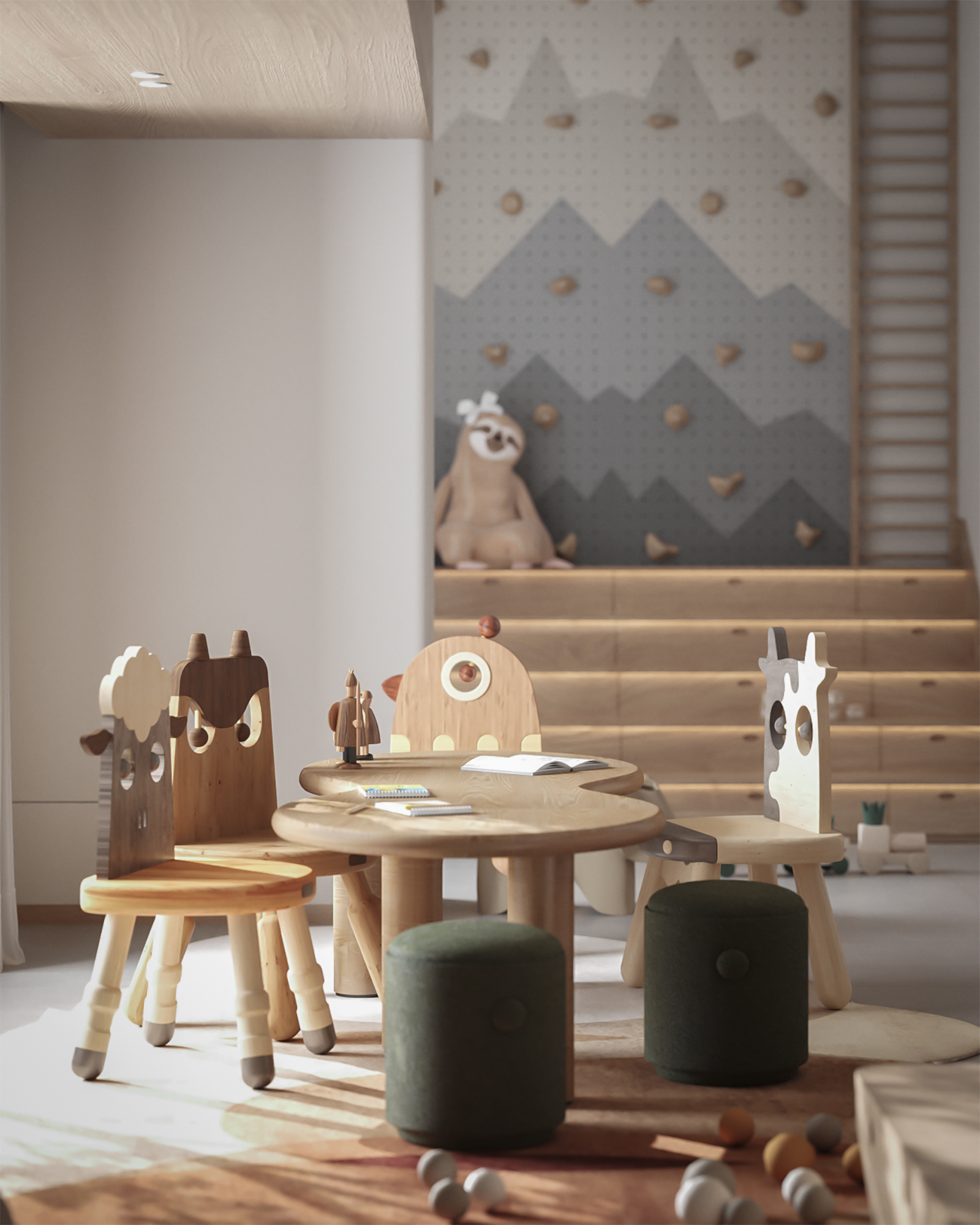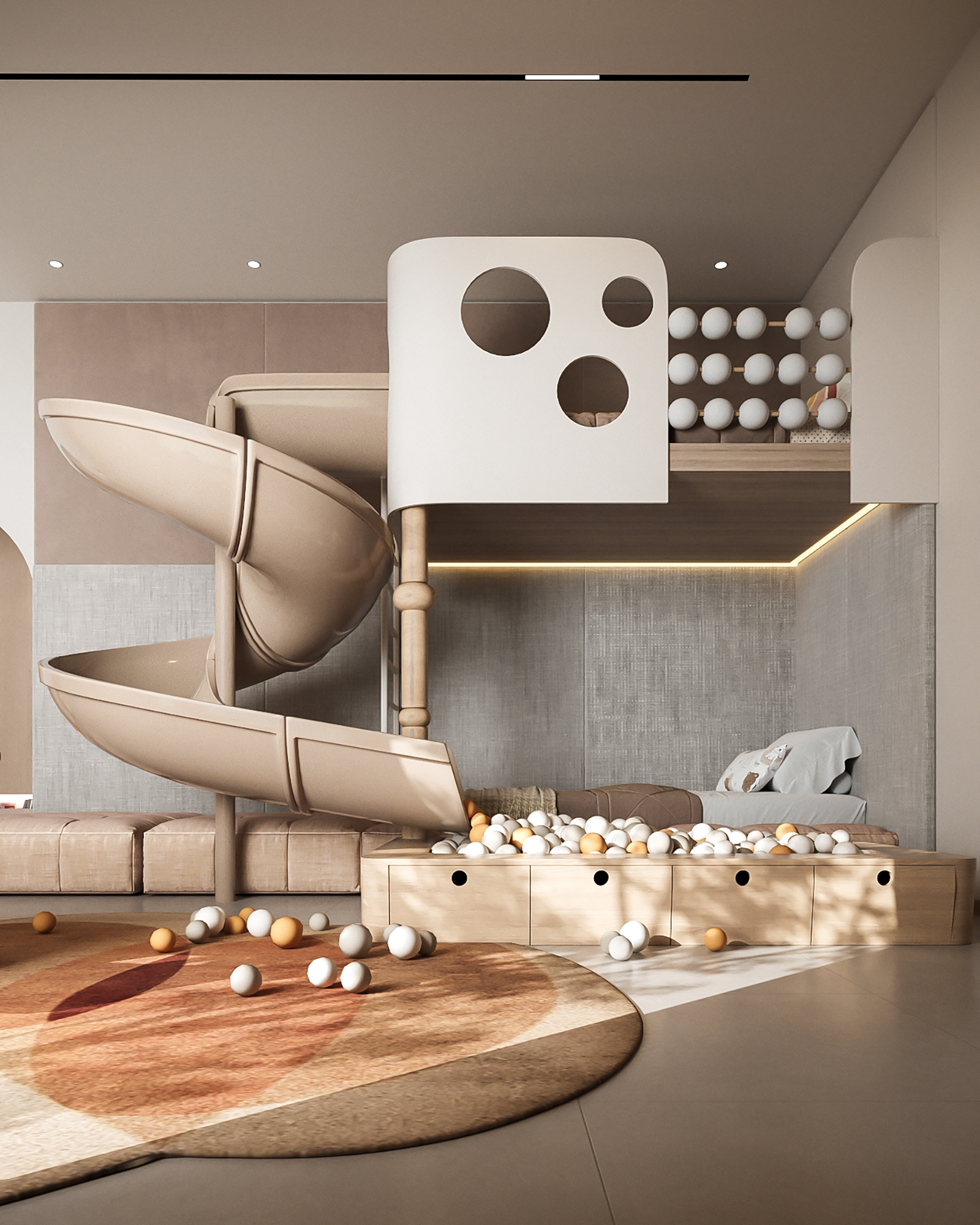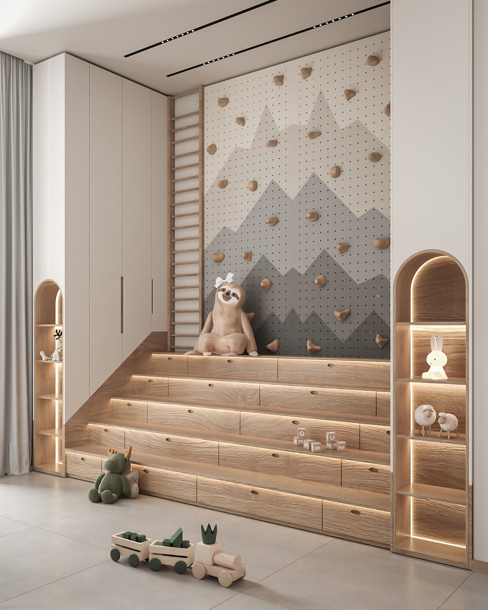 From the first glance, the room captivates with vibrant yet soothing colors, soft textures, and clever storage solutions. Every element has been carefully curated to create an environment that is safe, stimulating, and visually inspiring for children of all ages.