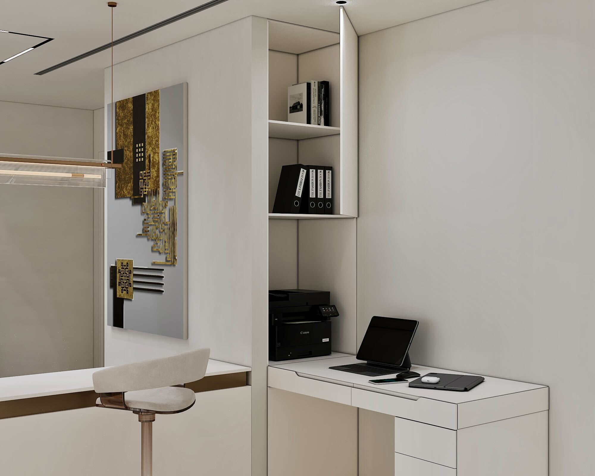 The office space blends functionality with style, ensuring a productive yet visually appealing environment. Custom storage units, sleek workstations, and ergonomic furniture enhance workflow efficiency, while the neutral palette and natural textures maintain a calm, professional atmosphere. Thoughtful lighting design and subtle décor elements add depth and dimension, balancing practicality with aesthetics.