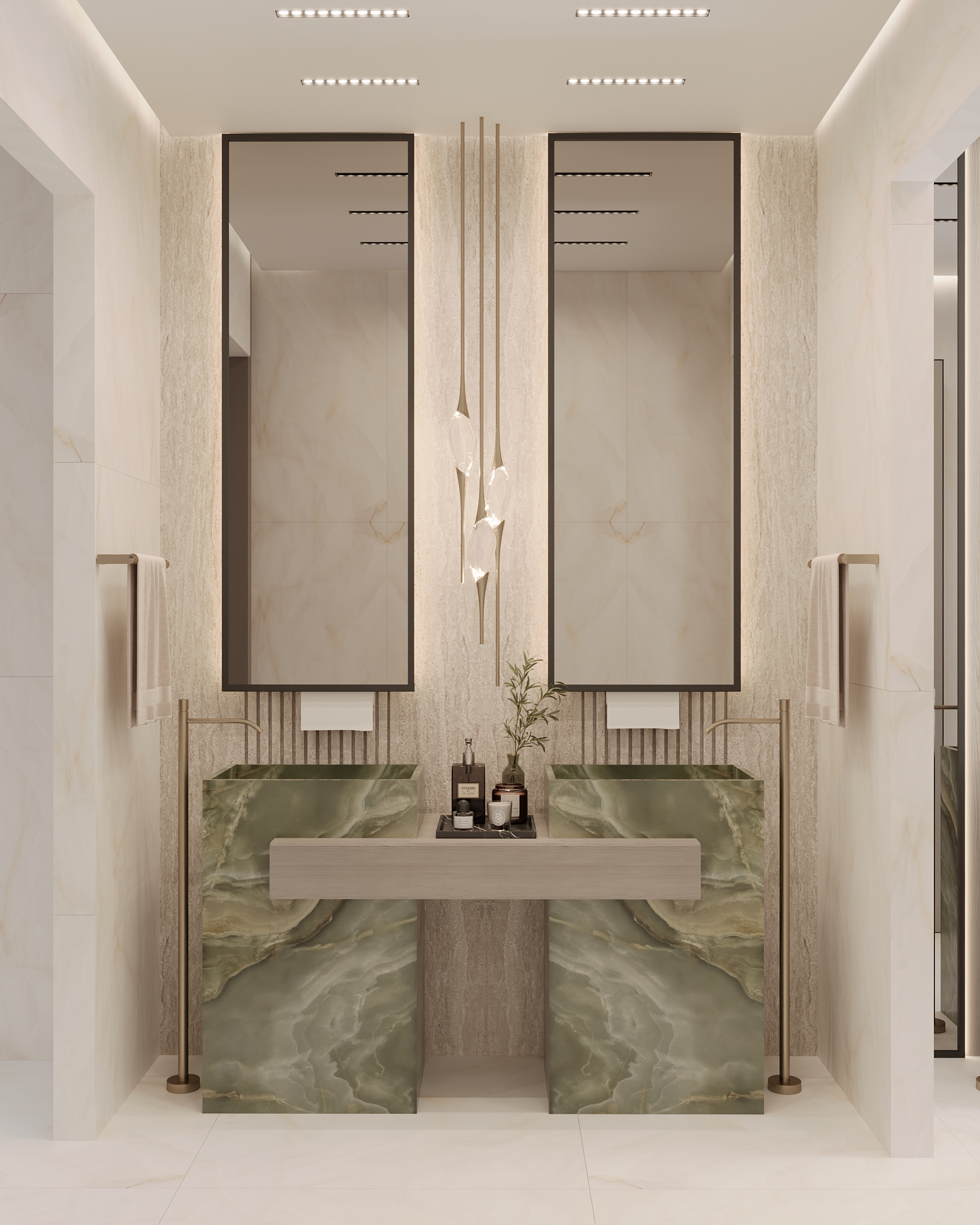 The villa includes specialized bathrooms designed with distinct personalities for every user. The boy’s bathroom and girl’s bathroom are tailored with modern fixtures, elegant tiles, and functional layouts, ensuring style meets everyday practicality. The guest bathroom is designed to impress visitors with its luxurious finishes and contemporary aesthetics.
