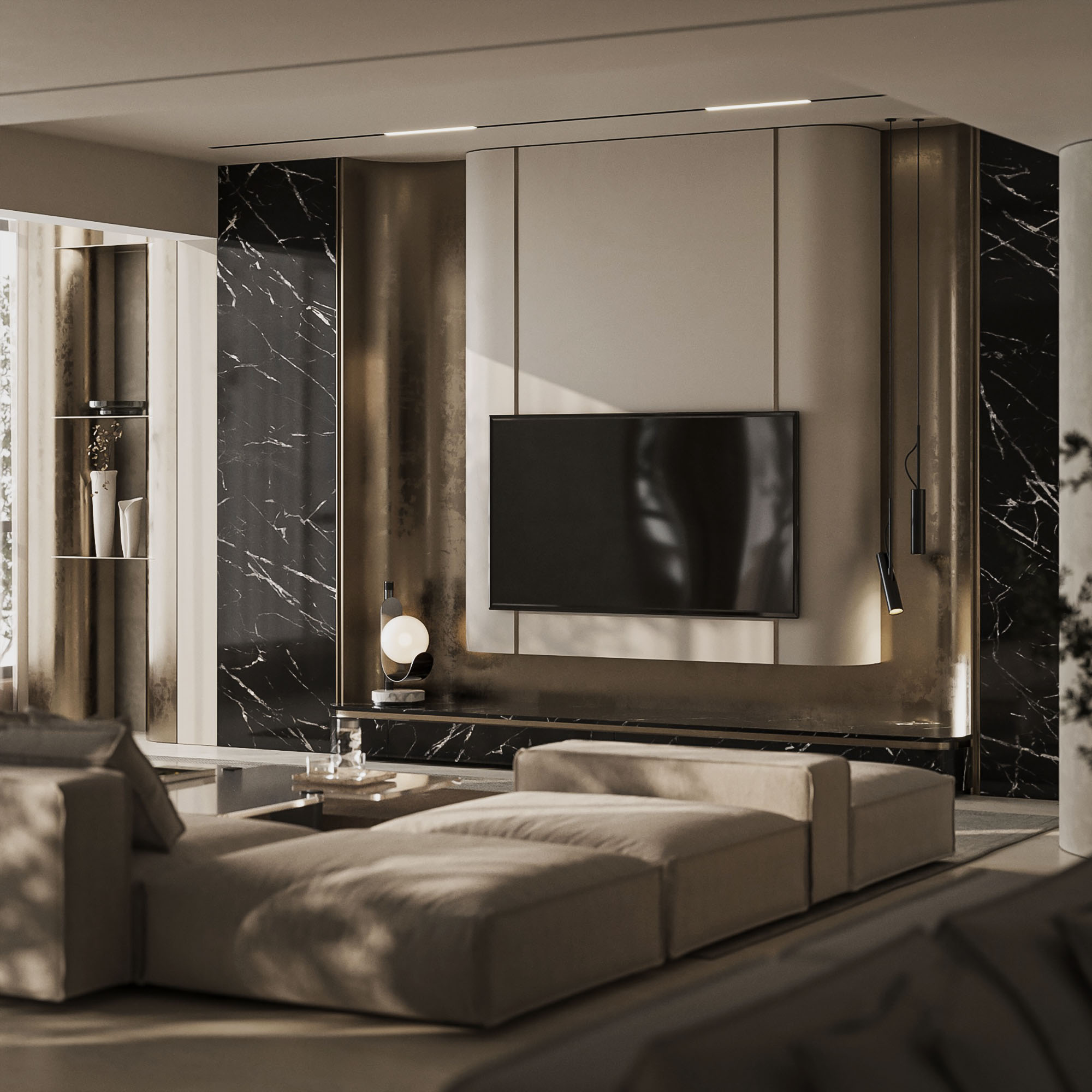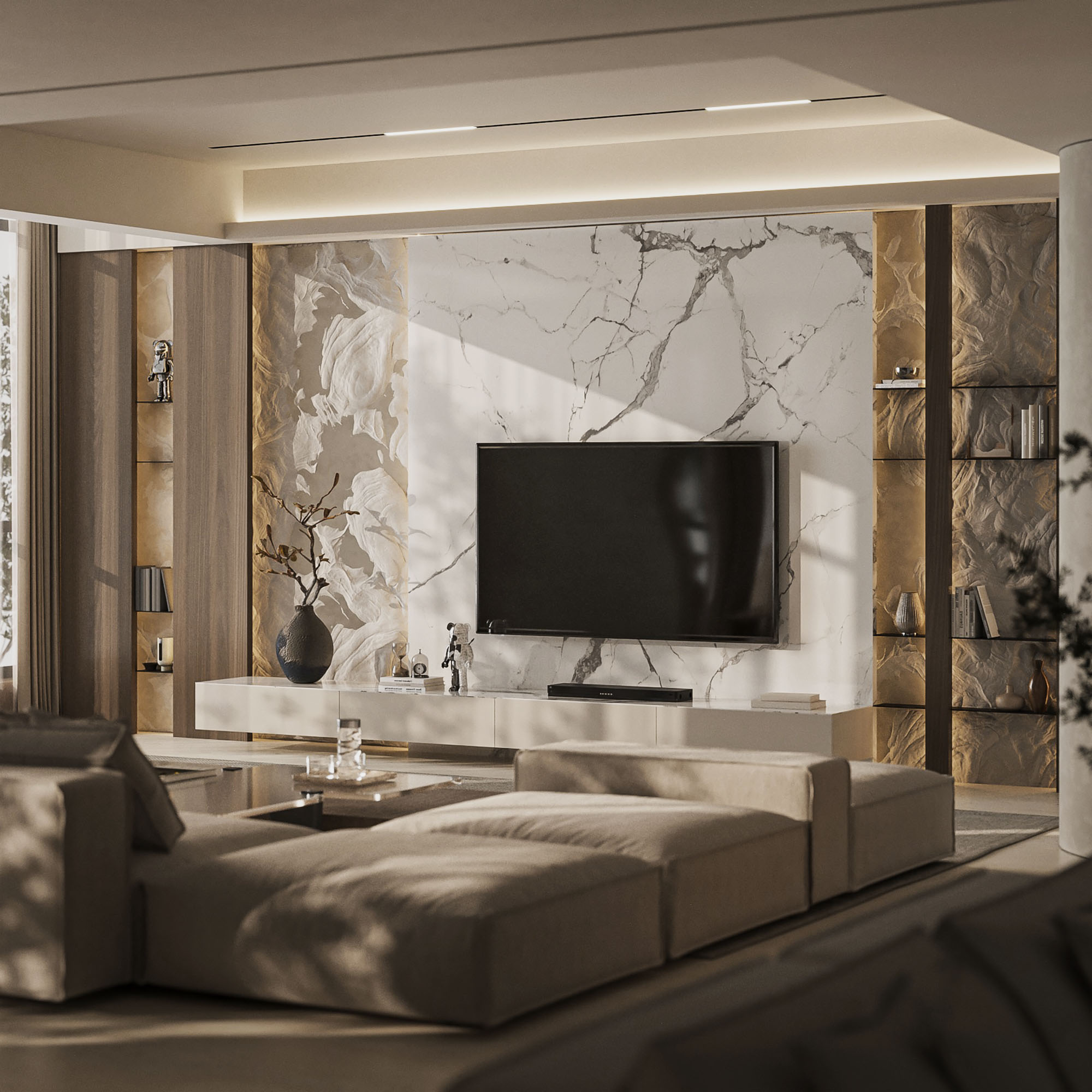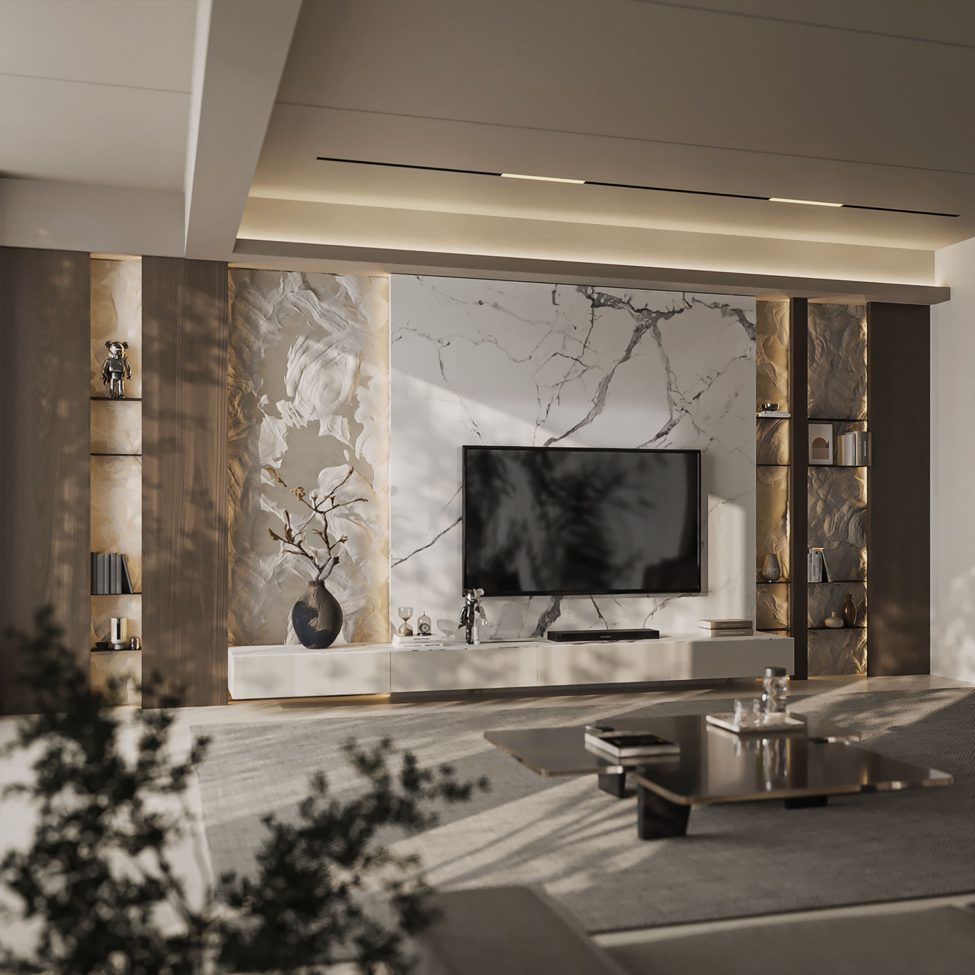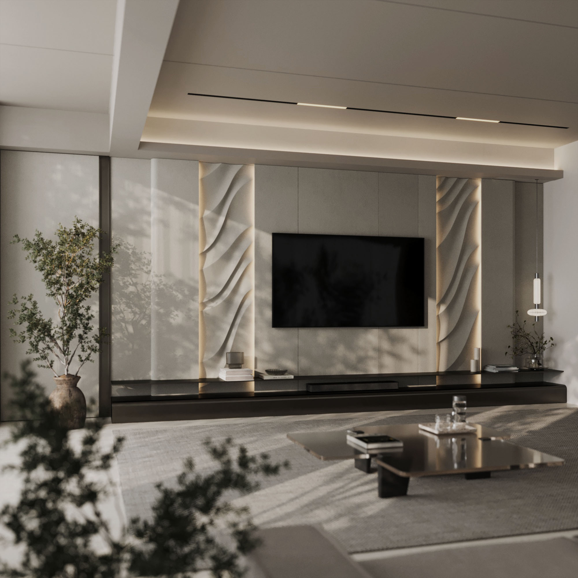 Step into this refined living space where modern sophistication meets artistic balance. The TV wall becomes more than just a functional feature—it’s a statement piece that defines the entire room’s character. With its smooth curved surfaces, seamless textures, and warm tones, the design evokes both calm and luxury.