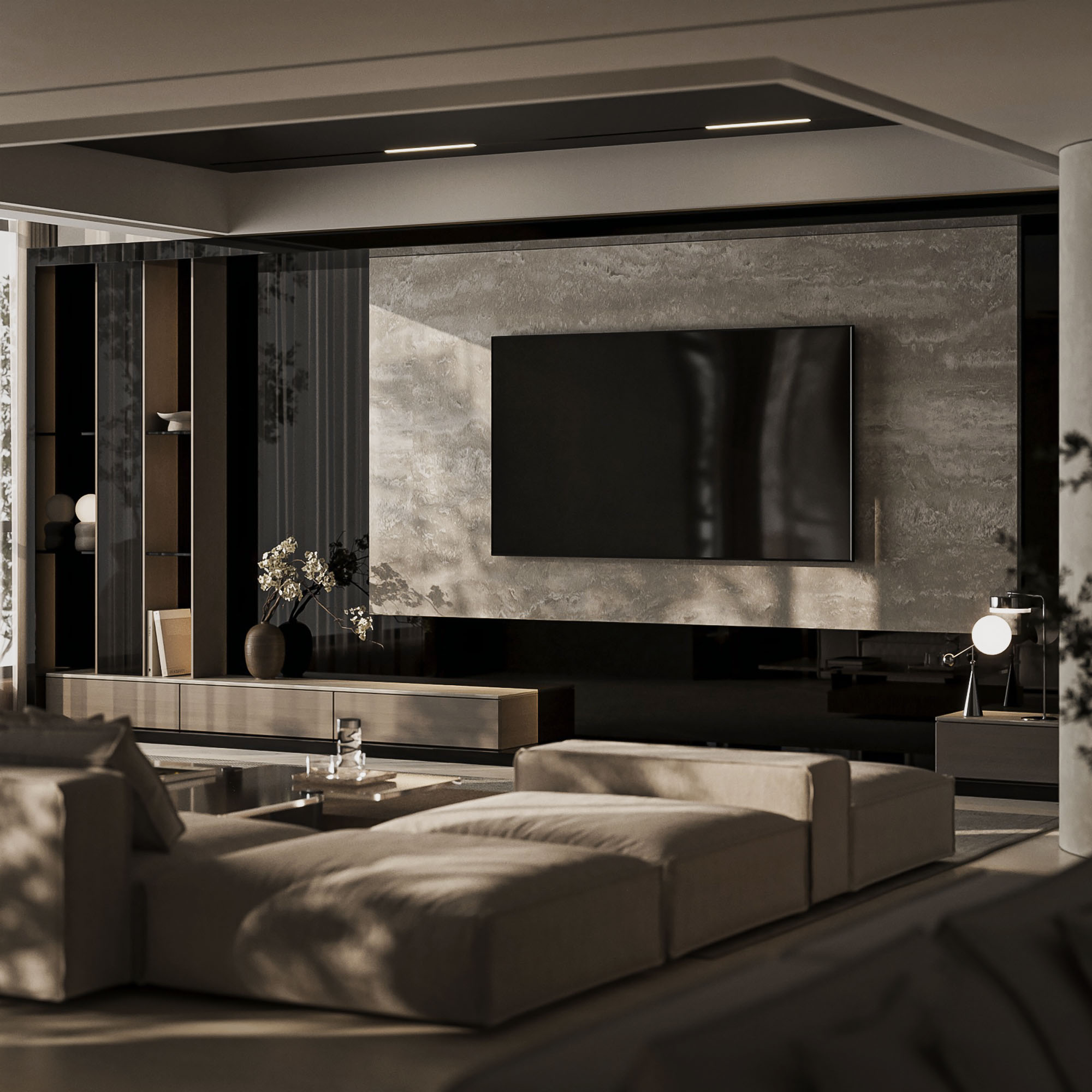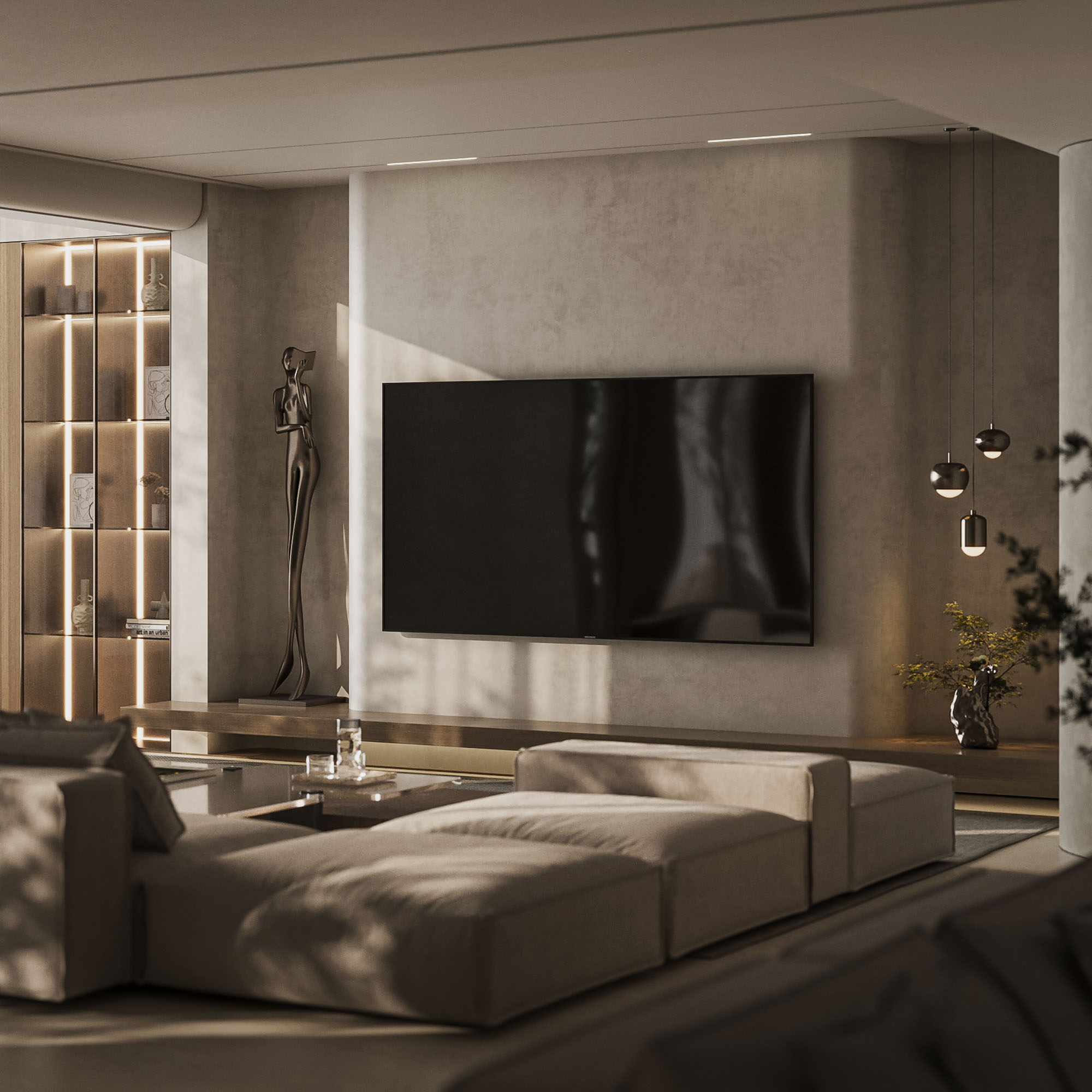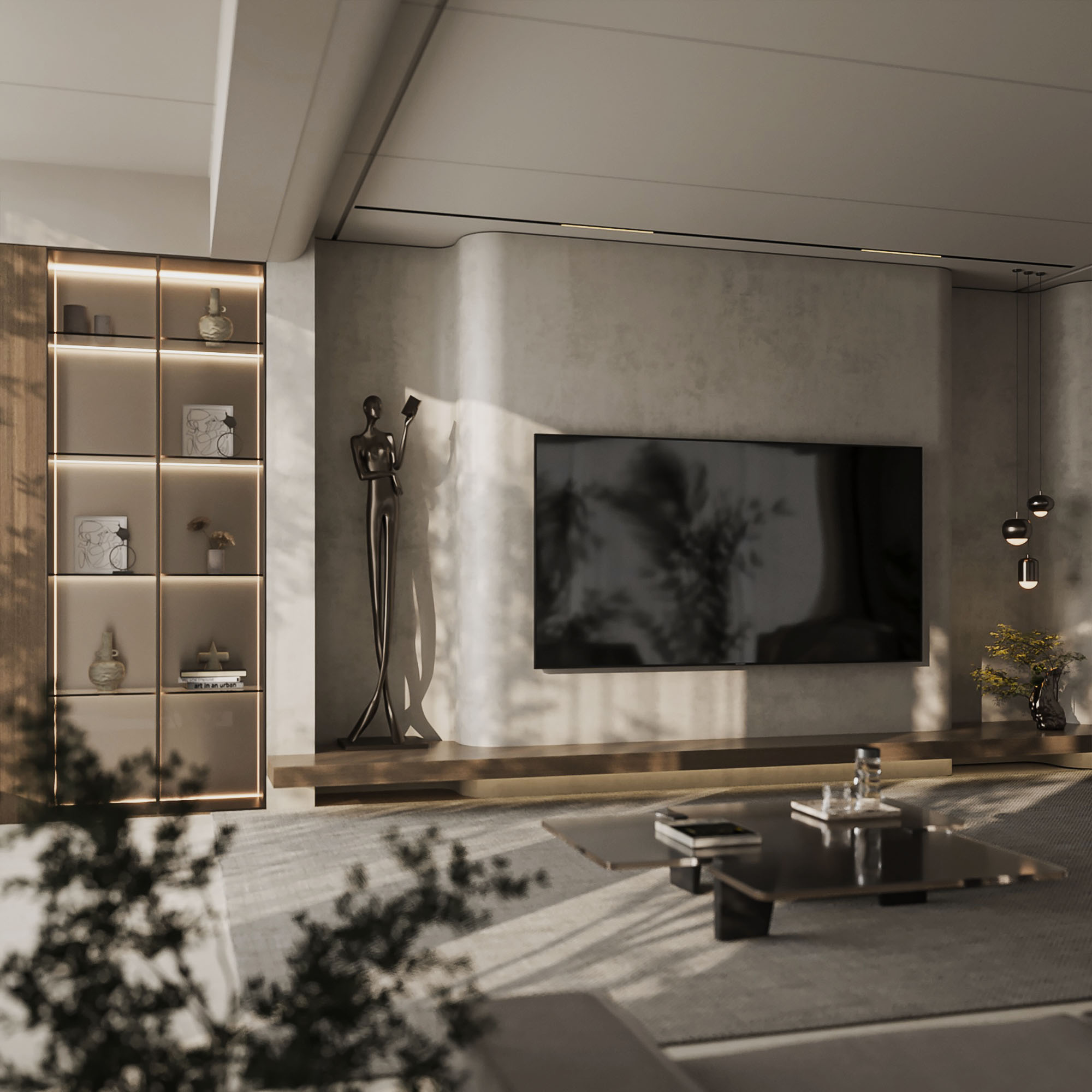 The central wall, finished in soft concrete texture, provides a subtle yet striking backdrop for the sleek, wall-mounted television. Beneath it, a floating console in rich wood tones adds warmth and balance while maintaining a clean, minimalist aesthetic. To the side, illuminated shelving frames curated décor pieces, art, and ceramics, bringing personality and depth to the composition.