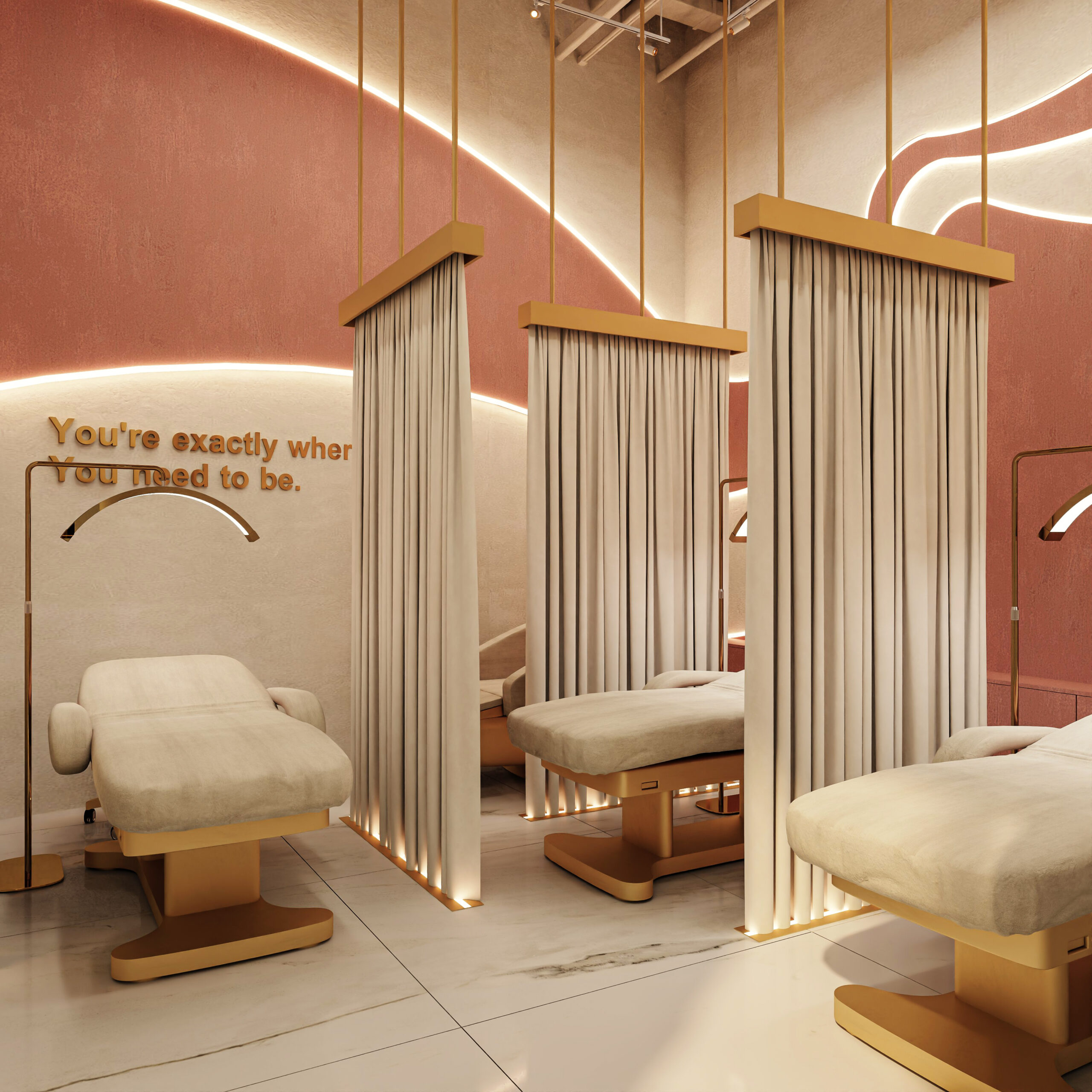 Private rooms are designed as personal sanctuaries, offering a calm and relaxing environment for beauty and wellness treatments. Soft textures, muted tones, and bespoke furniture create an intimate atmosphere while maintaining a sense of luxury and refinement.