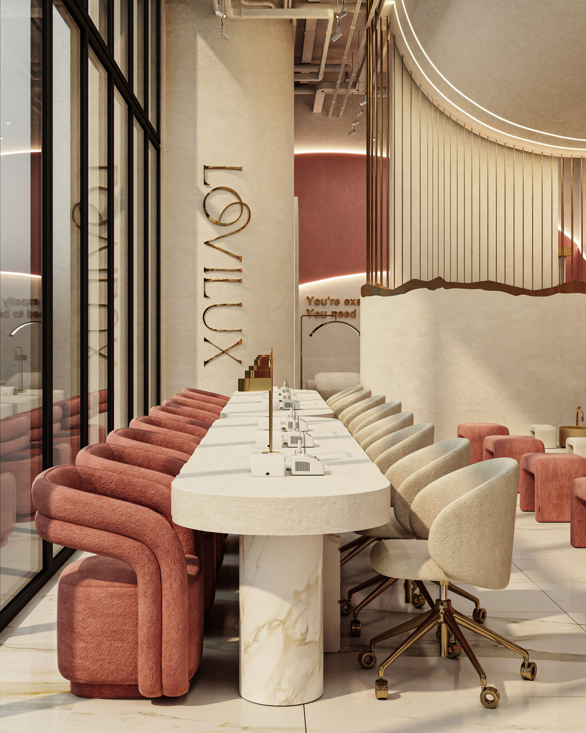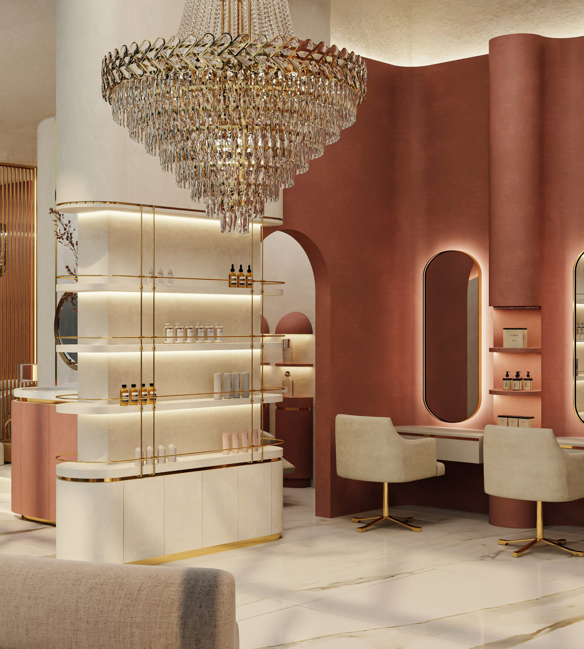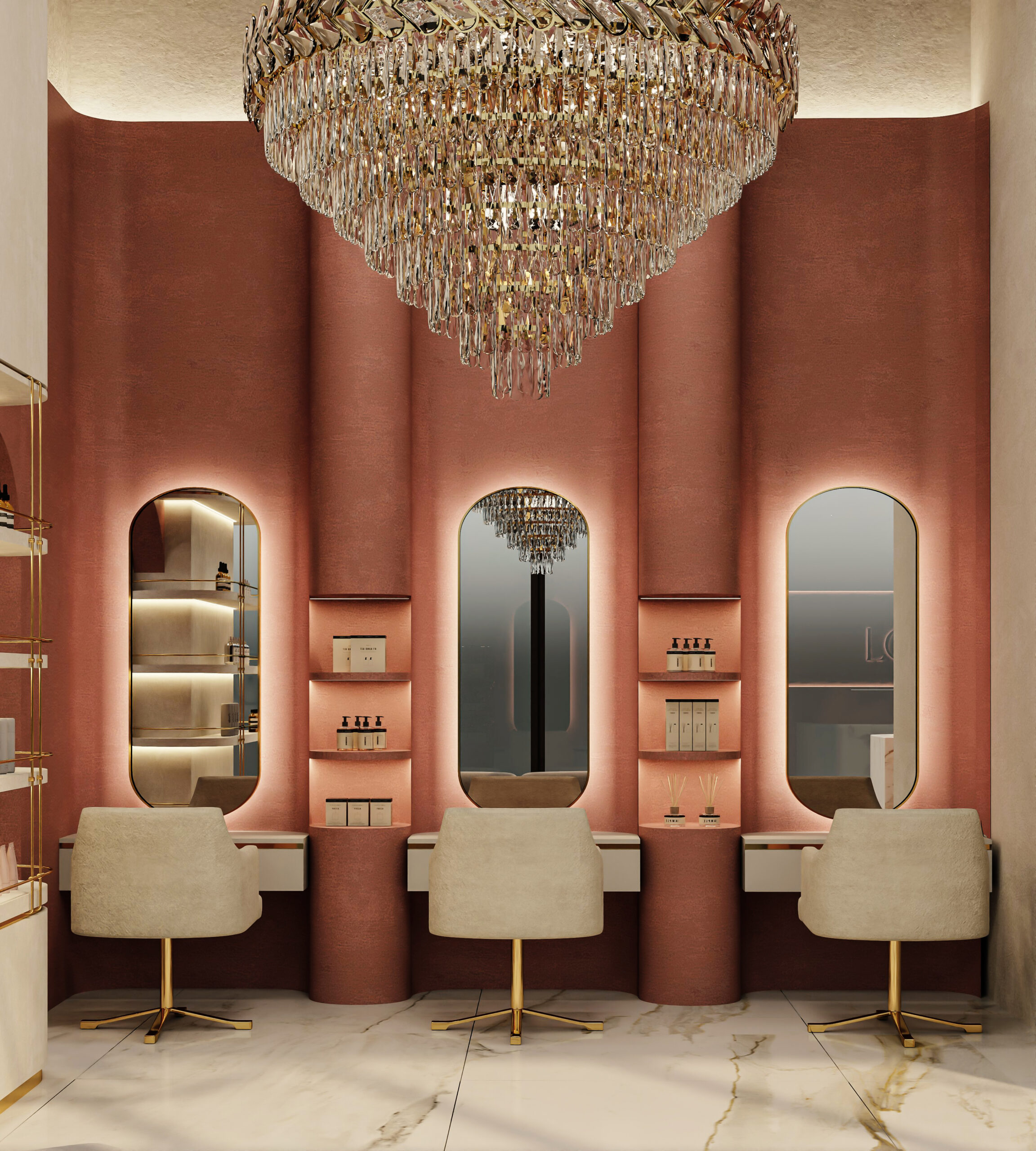 Every corner of the salon reflects attention to detail, from plush seating areas and customized service stations to ambient lighting and elegant décor elements. The design emphasizes a luxurious yet welcoming atmosphere, where both style and practicality coexist seamlessly.