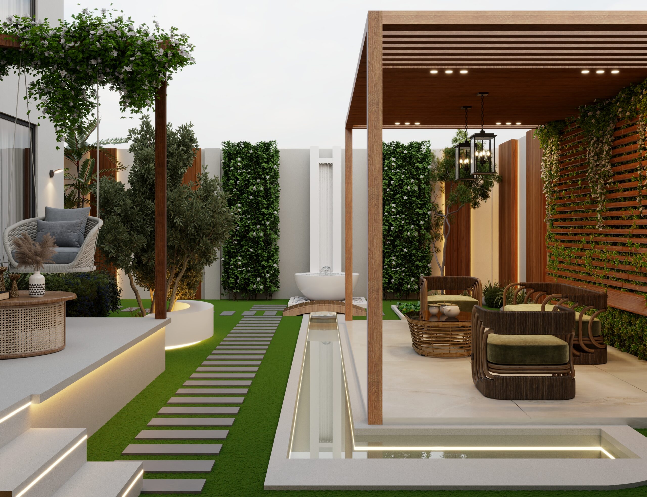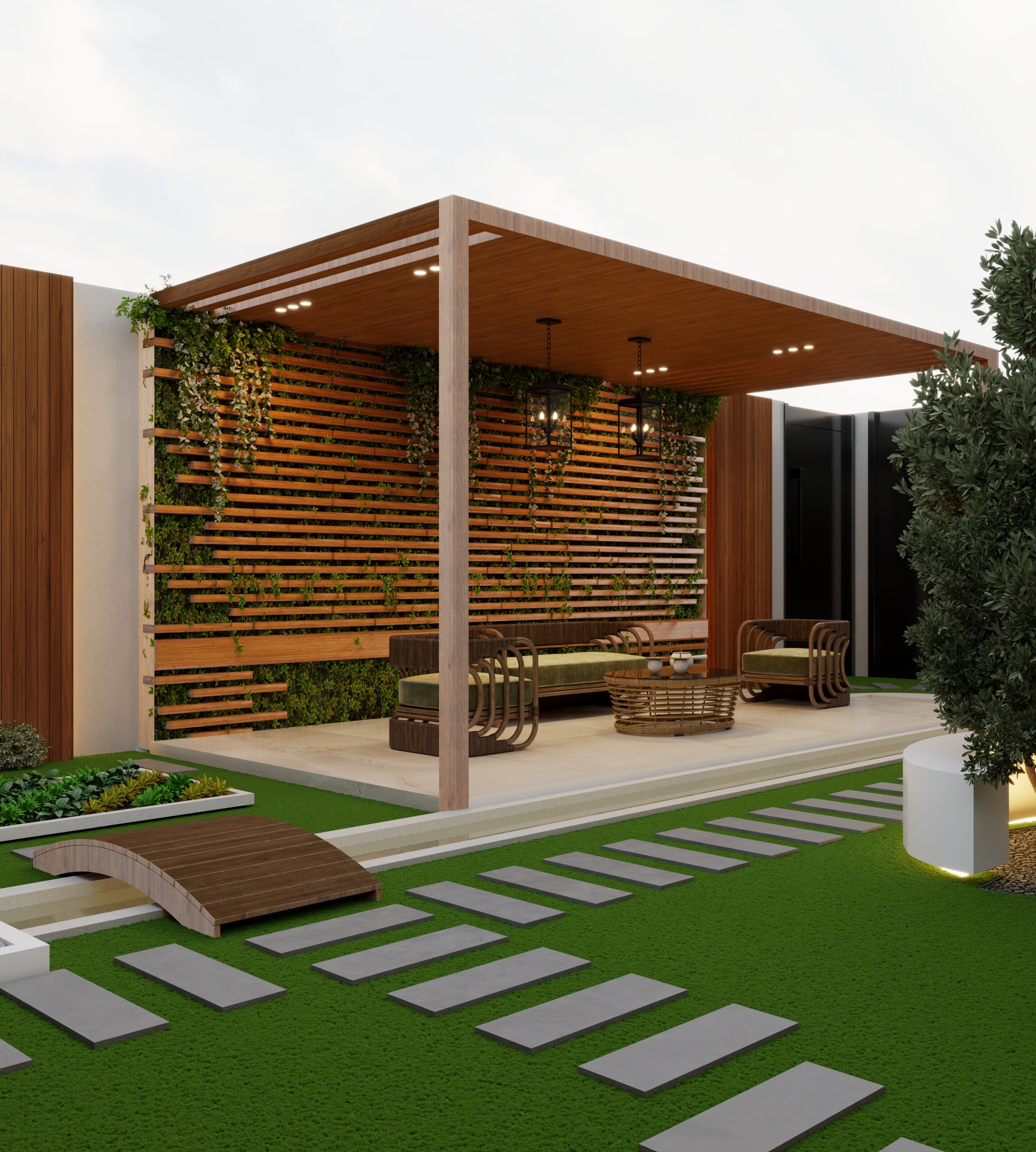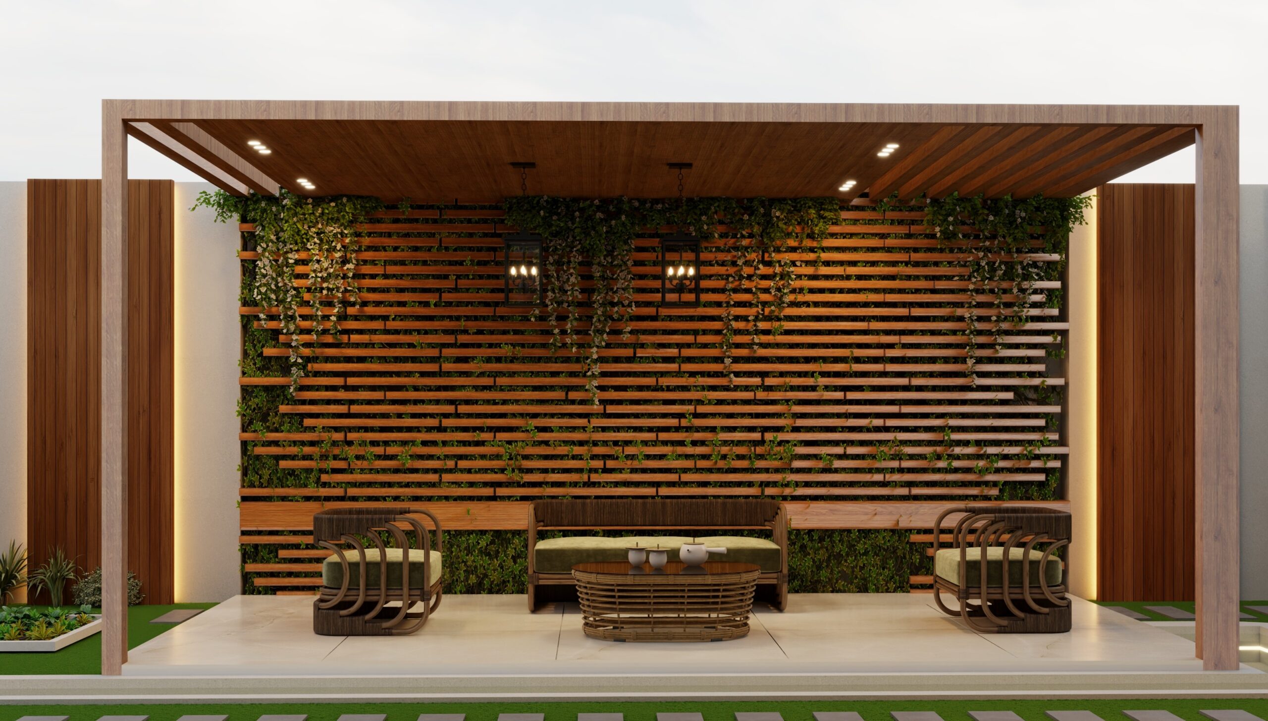 The landscaped outdoor area was designed as a modern oasis, featuring a wooden pergola with lush green walls and cascading plants. Comfortable seating arrangements and natural textures make this a perfect retreat for relaxation and family gatherings, embodying the spirit of sustainable outdoor living.