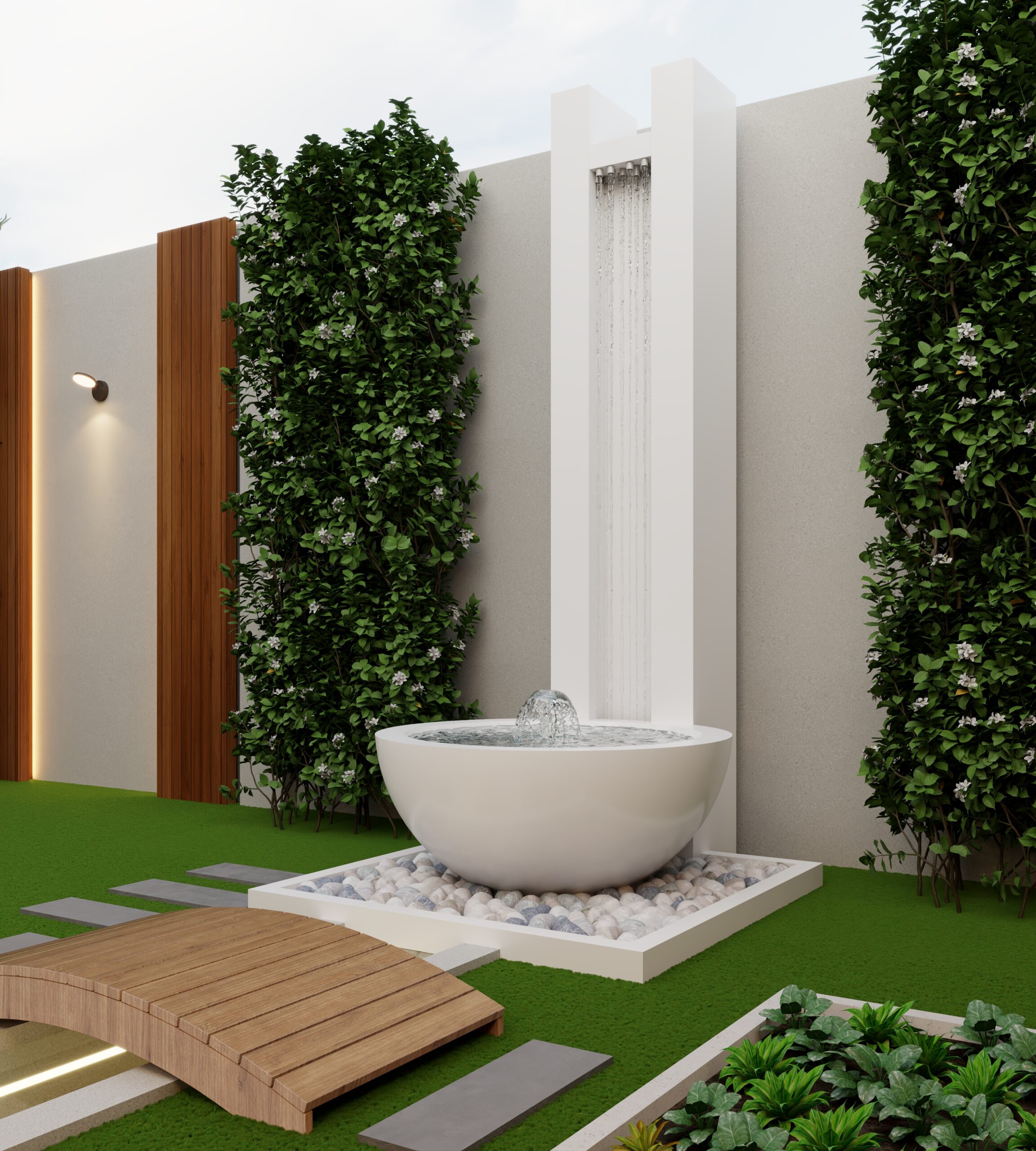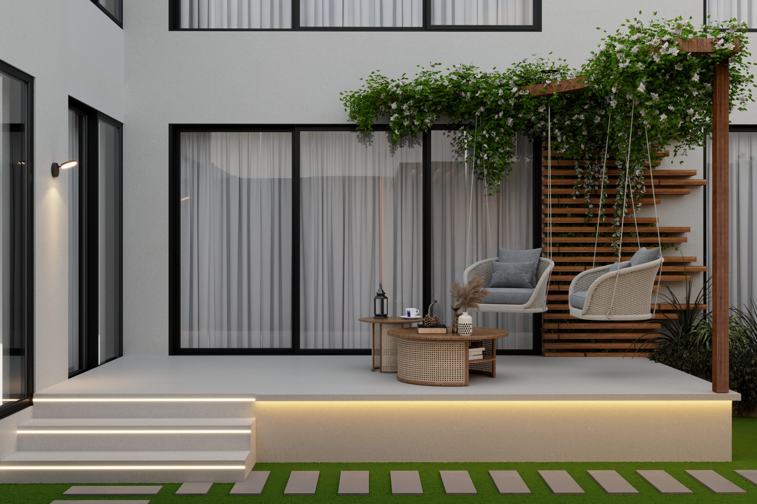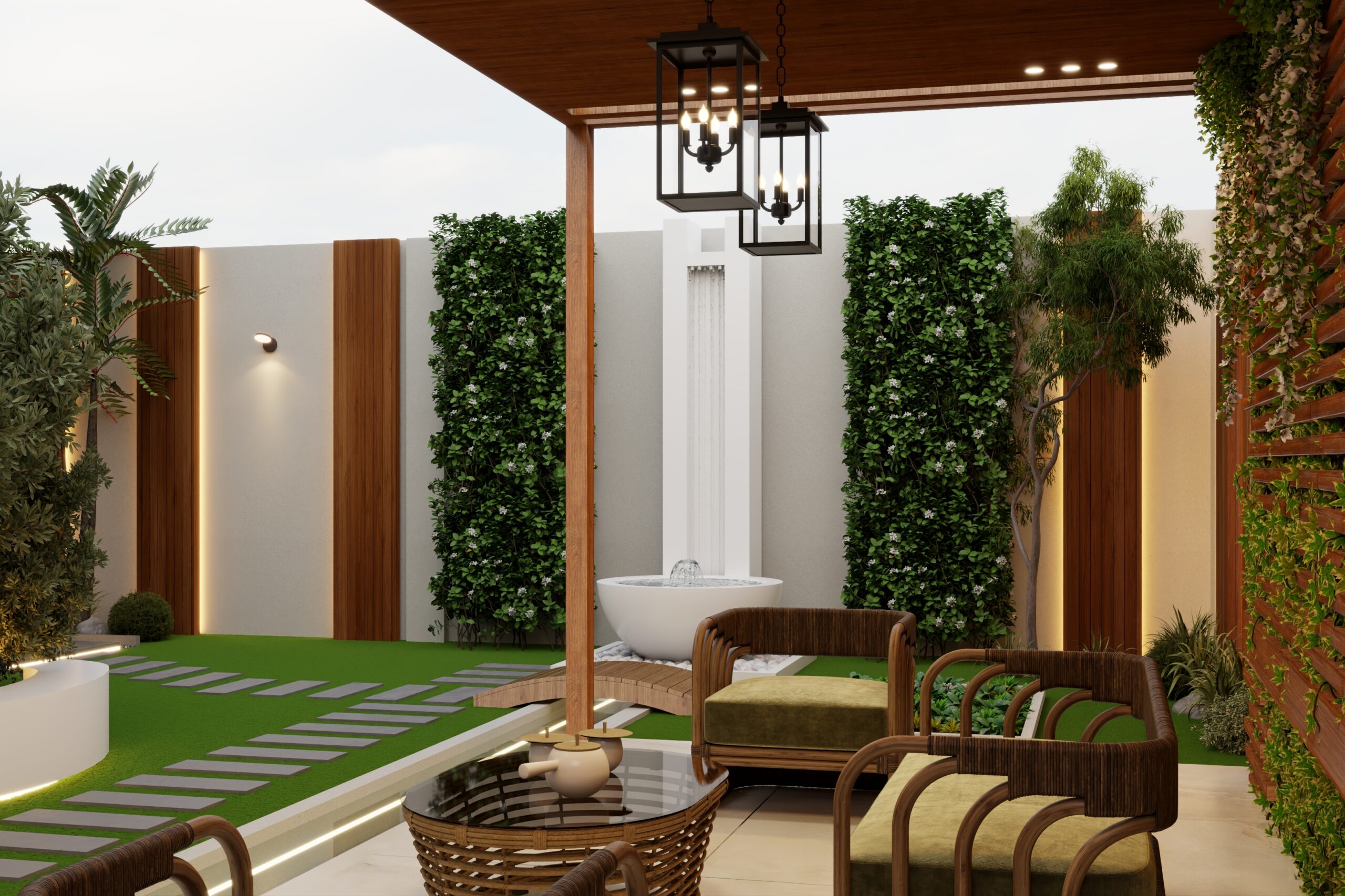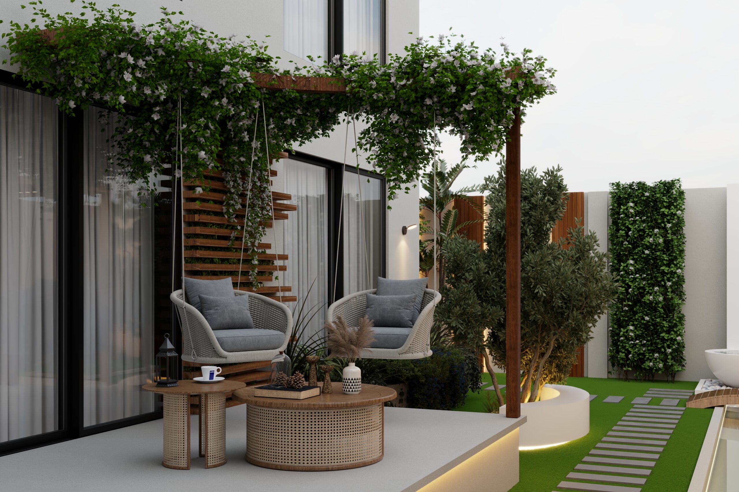 The landscaped outdoor area was designed as a modern oasis, featuring a wooden pergola with lush green walls and cascading plants. Comfortable seating arrangements and natural textures make this a perfect retreat for relaxation and family gatherings, embodying the spirit of sustainable outdoor living.