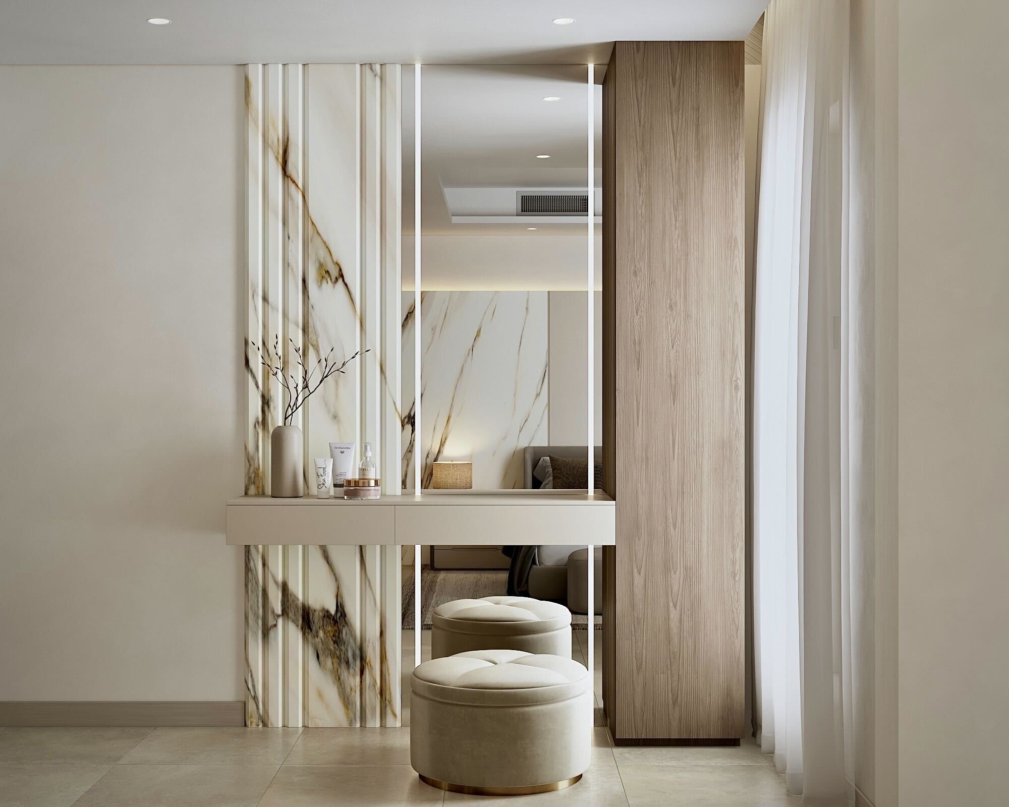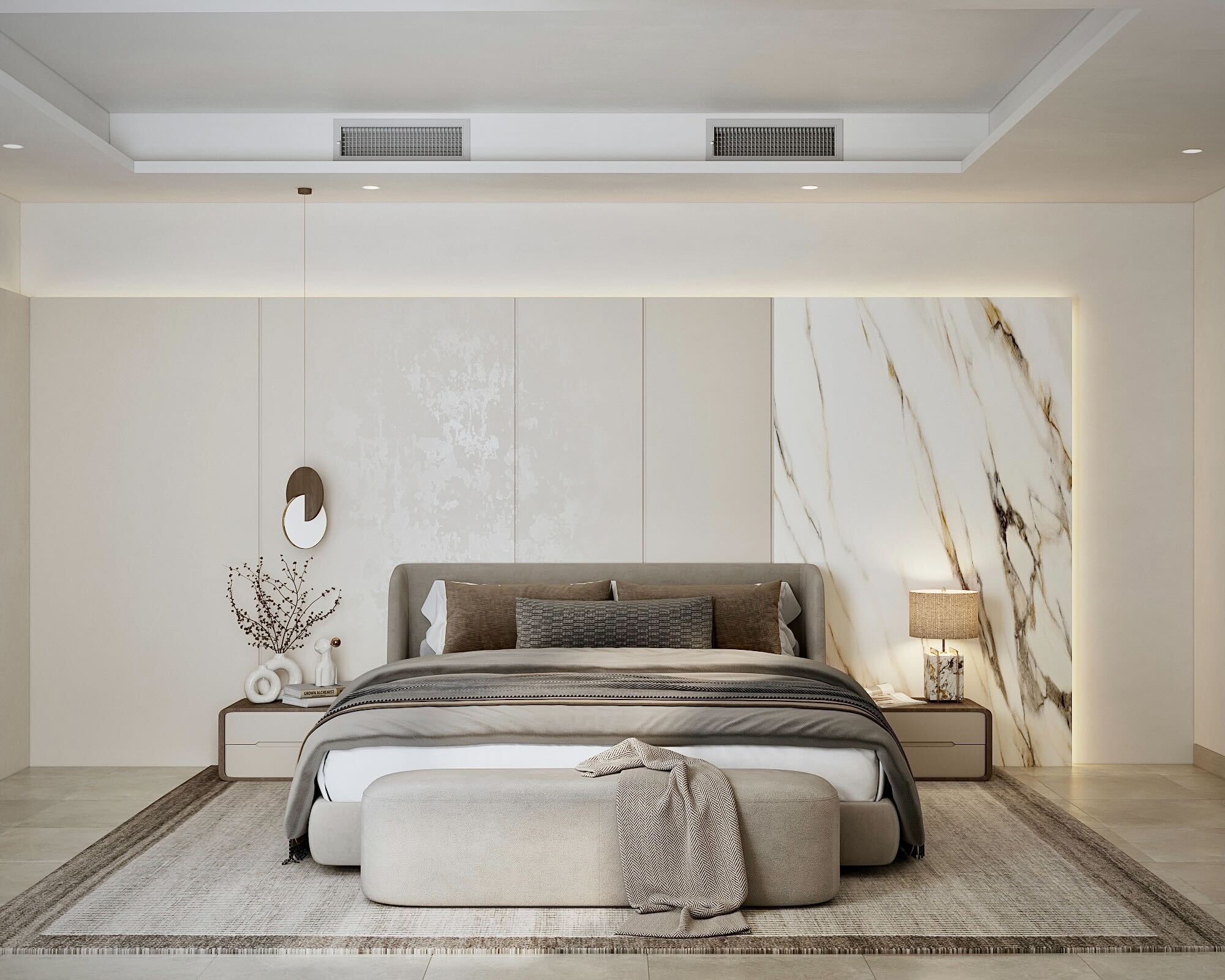 The master suite exudes comfort and sophistication, designed with layered textures, soothing colors, and functional elegance. Every detail—from the lighting to the furniture layout—has been carefully planned to create a peaceful and private retreat.
