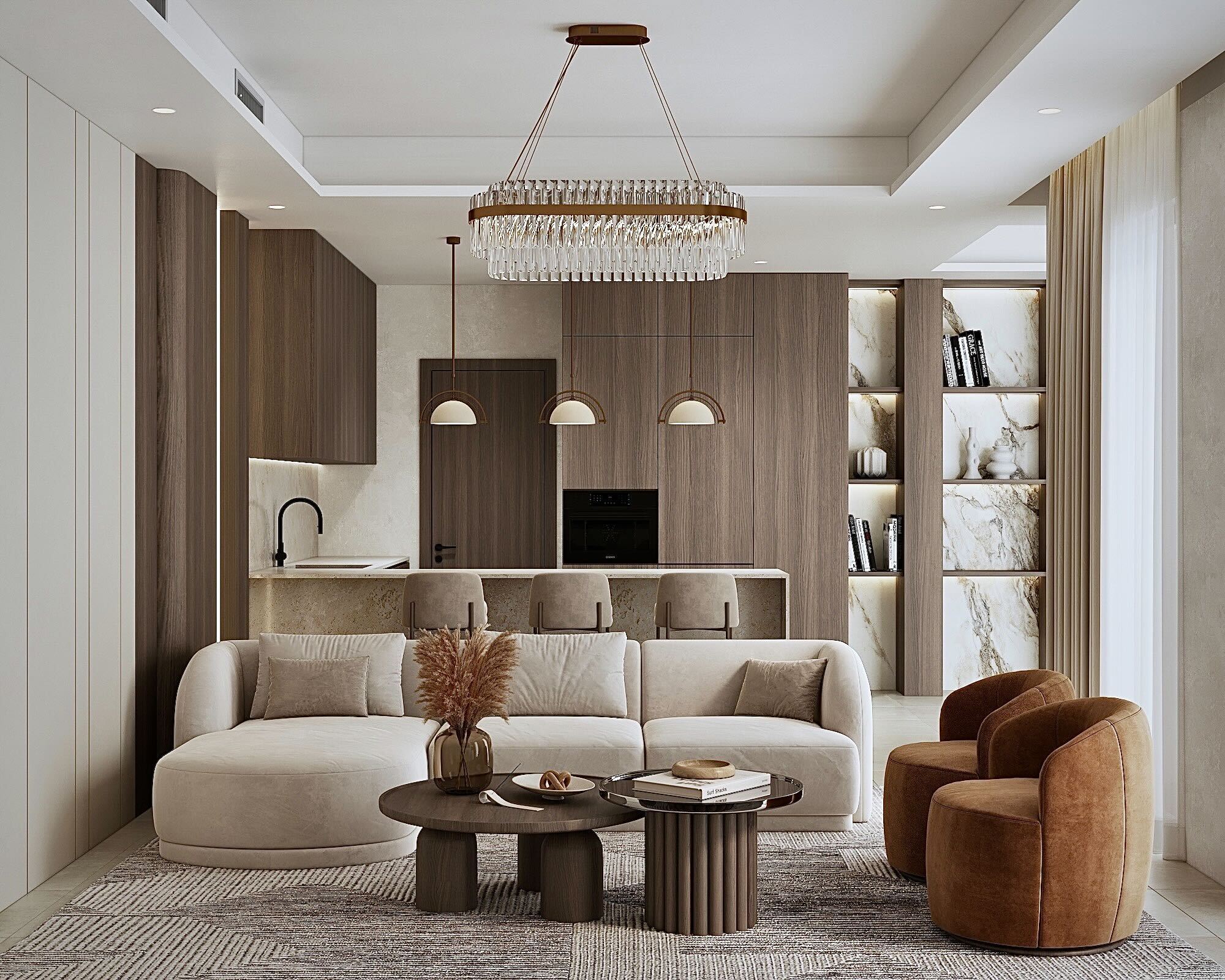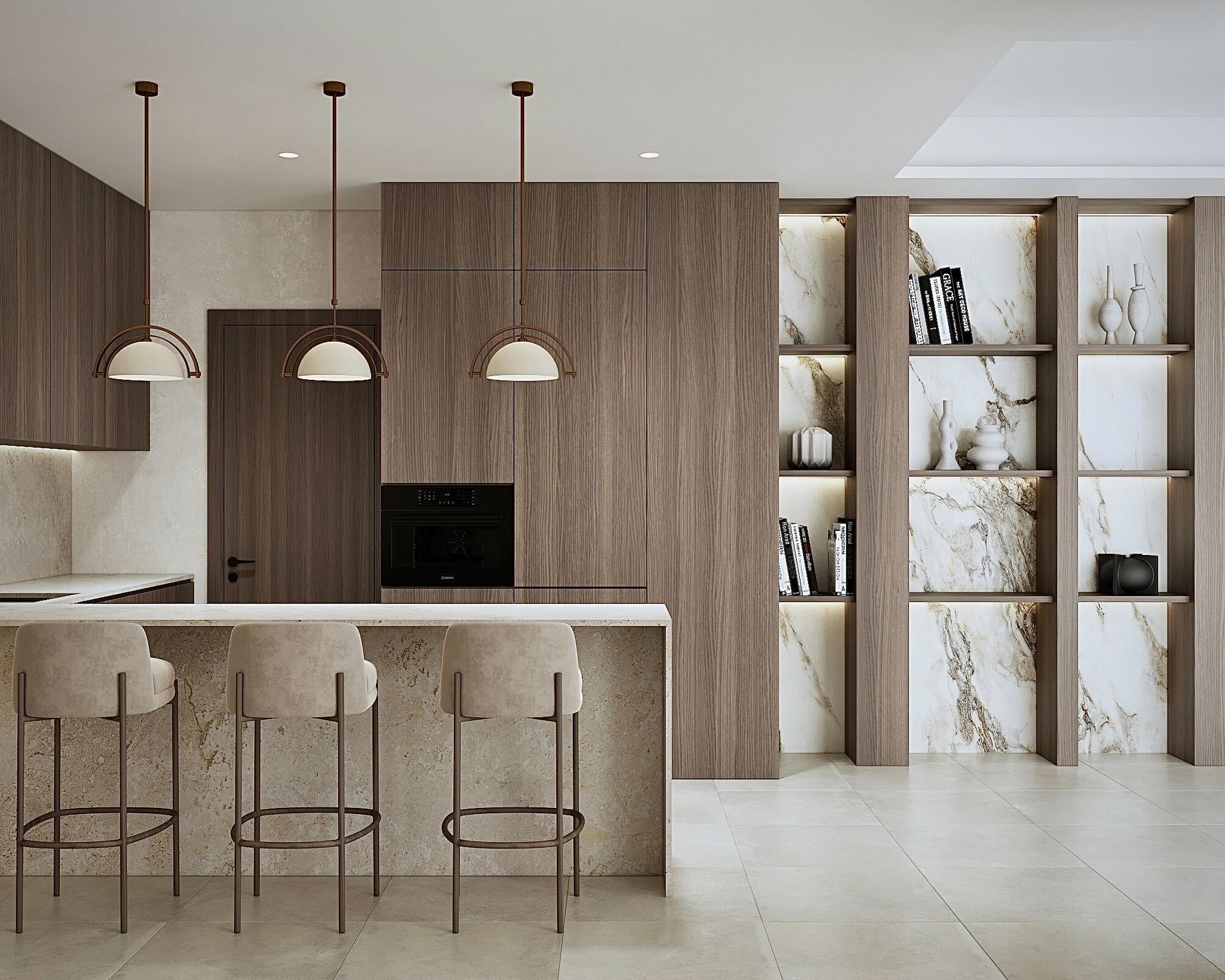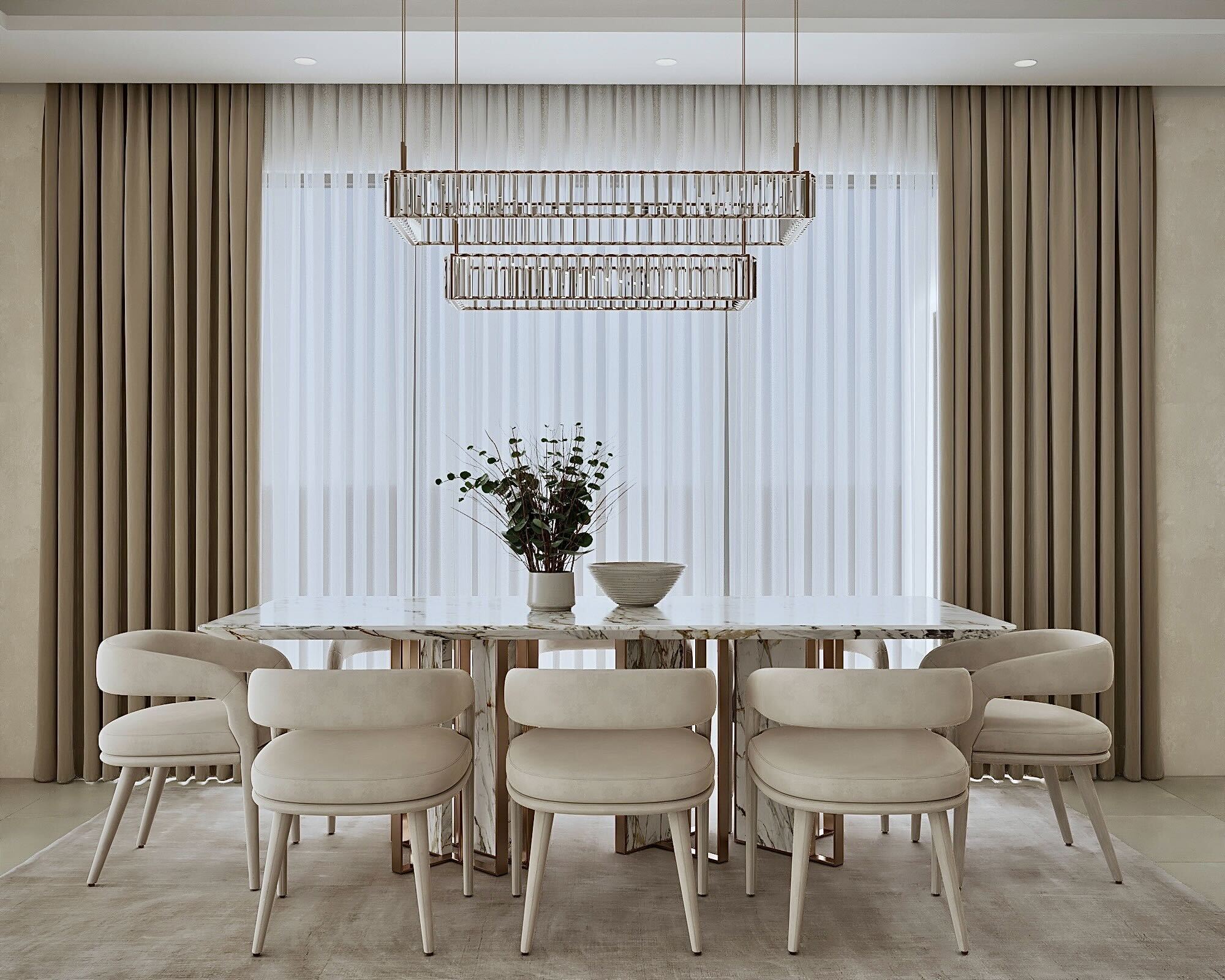 The interior design follows a neutral and earthy tone palette, combining marble finishes, warm wood, and soft lighting. The dining area showcases a sleek marble-top table, modern pendant lights, and elegant upholstered seating—bringing understated luxury to everyday moments.