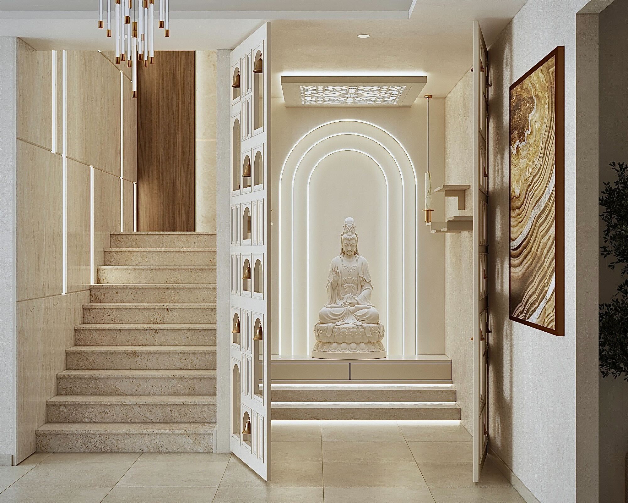 A serene and spiritually uplifting pooja space welcomes residents with a white sculptural deity feature, framed by elegant arches and soft backlighting. The minimalist palette and carved panel detailing add purity and calmness, making this sacred corner a true sanctuary within the home.